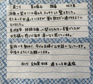 首コリ、頭痛、肩コリ、吐気で痛み止めの薬が手ばなせ無かった頑固な症状が改善した40代前半女性。