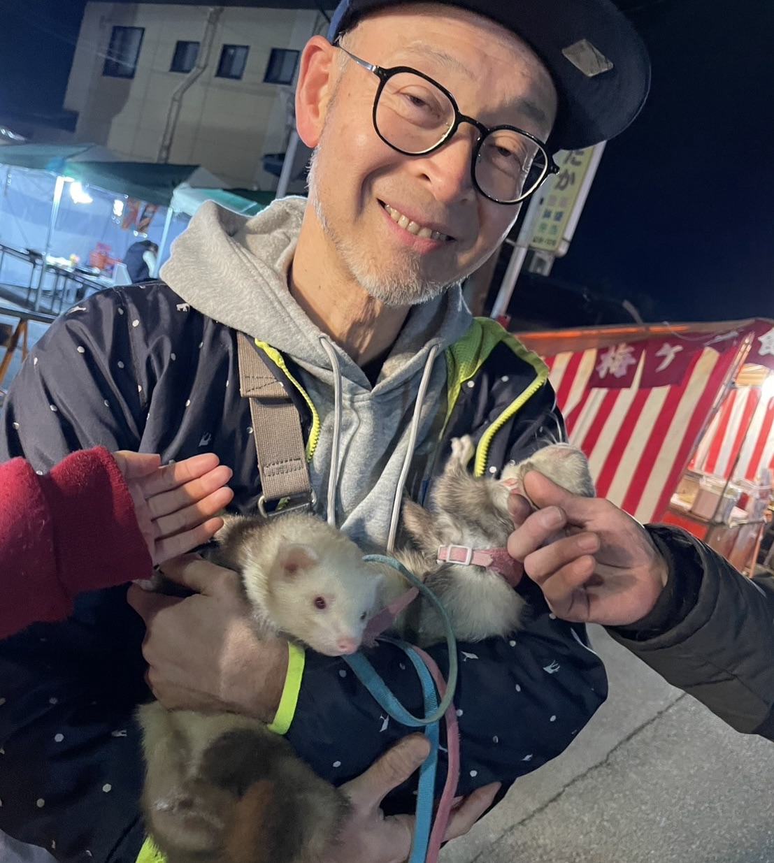初日の昼間に行ける初市ってどれぐらい振りだろう!突然フェレットを散歩させてる叔父さんに抱っこしてごらんと2匹渡されてひきつり気味の筆者😅